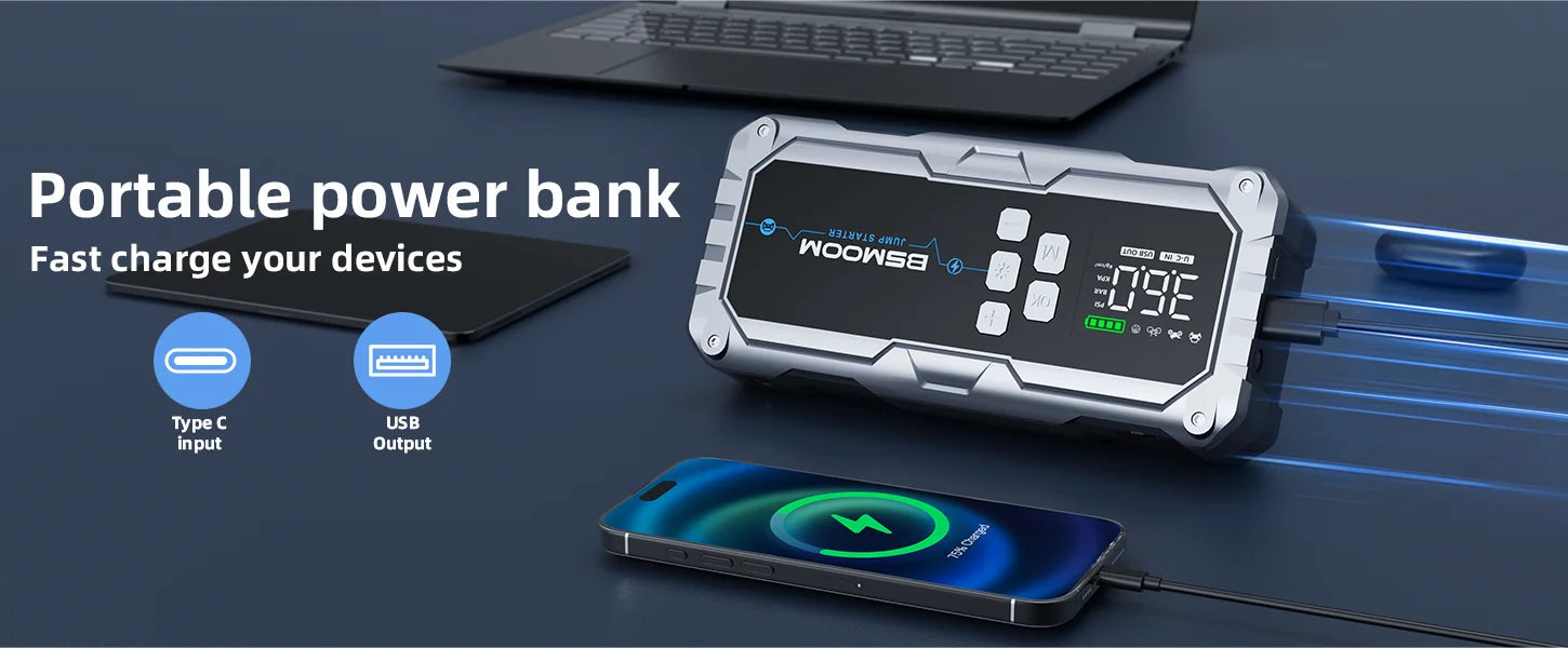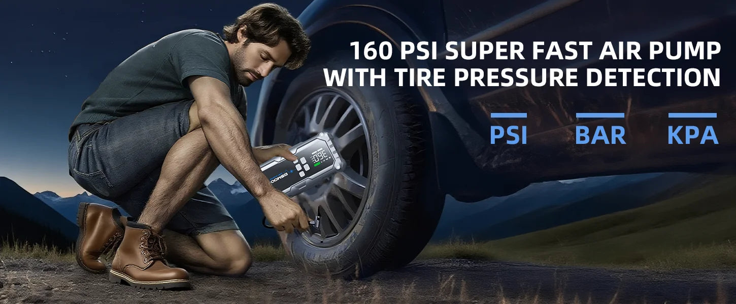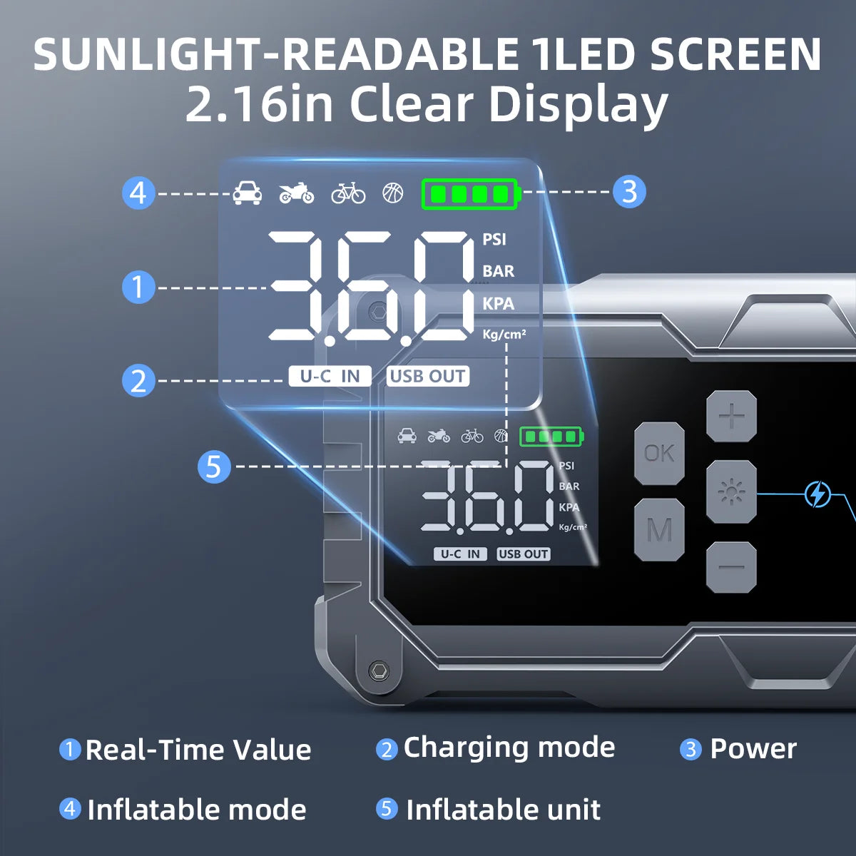 Complete roadside emergency solution combining a powerful 7000A jump starter with integrated 150PSI air compressor. Perfect for drivers who want reliable backup power and tyre inflation in one compact device.