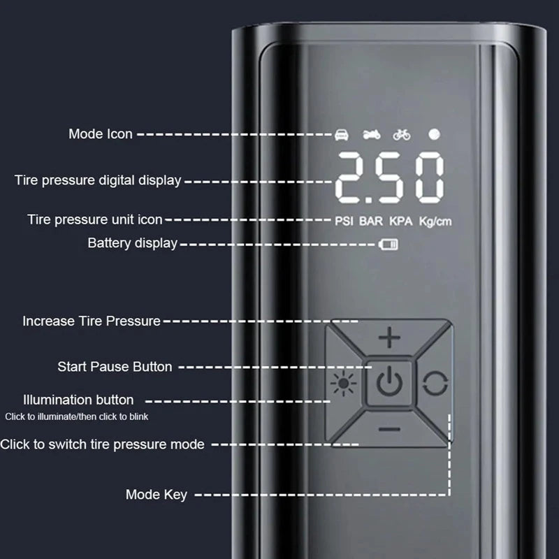 Keep your tyres perfectly inflated with this portable wireless air compressor. Designed for cars, motorcycles, bicycles, and sports equipment, this rechargeable inflator delivers reliable performance wherever you need it.