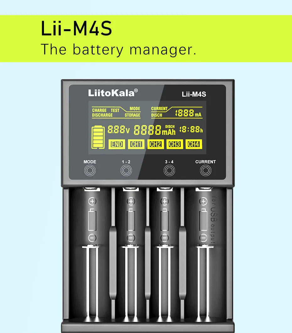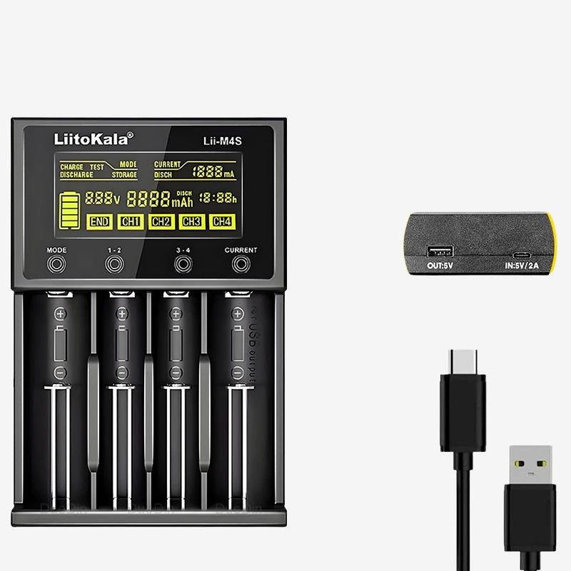 Professional 4-slot battery charger with LCD display for all your rechargeable batteries. Perfect for photographers, vapers, flashlight enthusiasts, and anyone who relies on high-performance batteries. Features intelligent charging with capacity testing and USB power bank functionality.