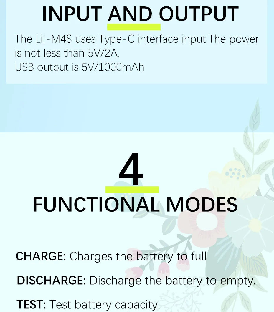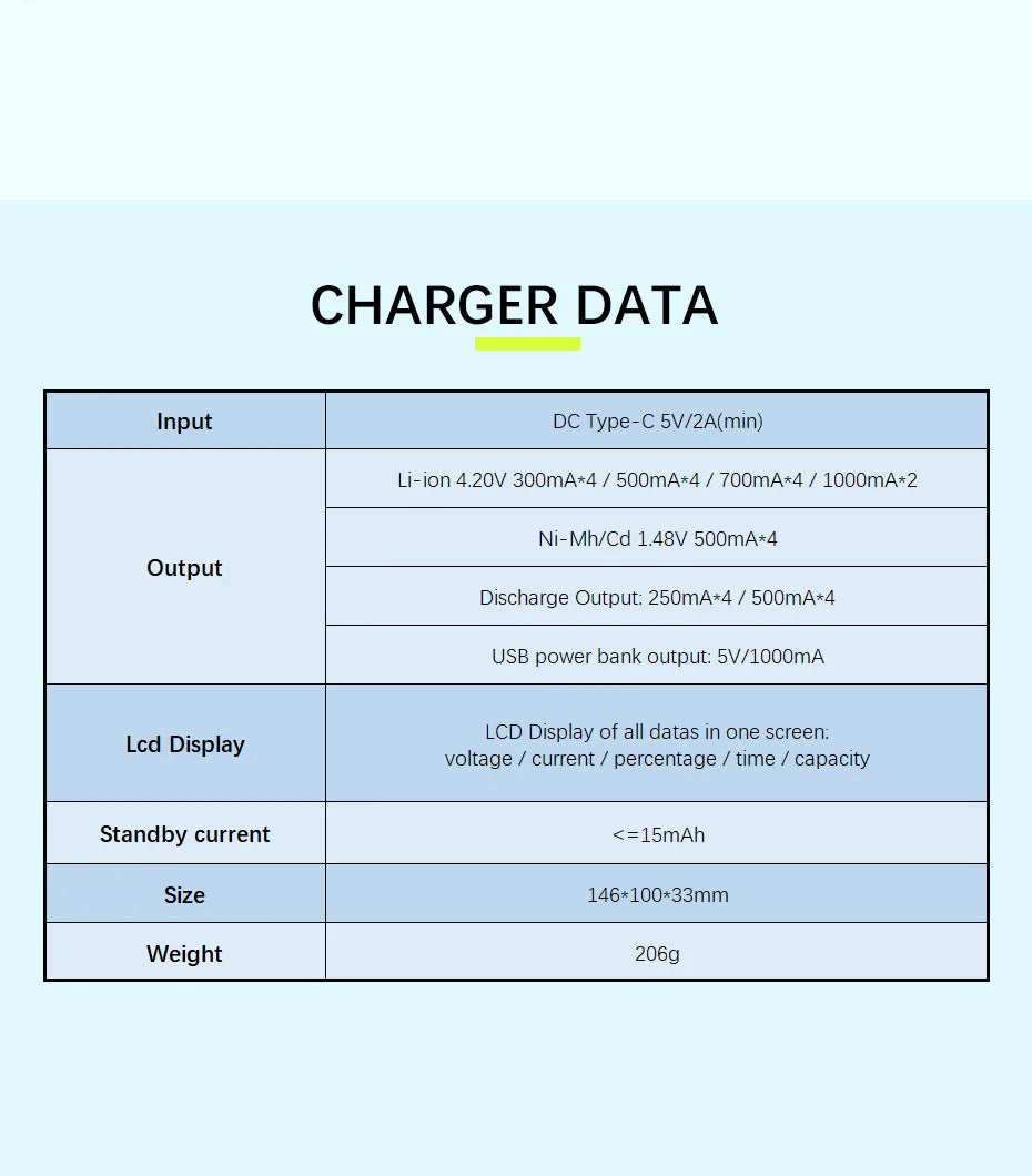 - Compatible Batteries: Li-ion (10440, 14500, 18650, 21700, 26650), Ni-MH (AA, AAA, AAAA)